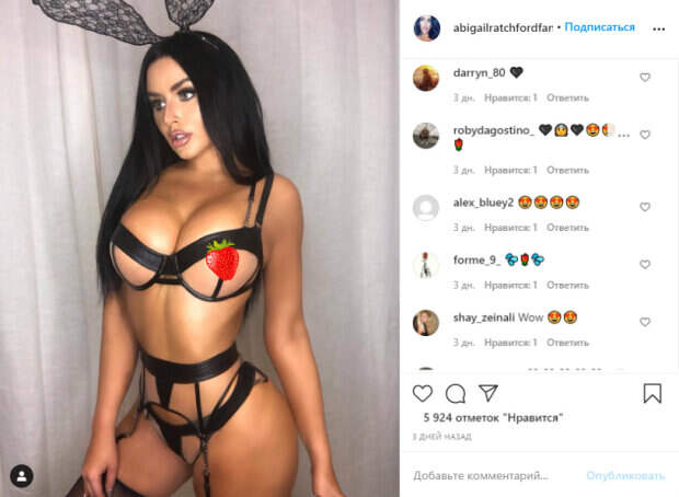 Даже в кружевном белье или белье из одних полосок ткани она не демонстрирует бюст или ягодицы в излишне откровенном виде. На одном из фото Эби можно отчетливо увидеть, как она прикрывает лишнее, оставляя место для воображения, и при этом впечатляет образами в разнообразном белье. Кружева, ленточки, стяжки или подвязки – все это Рэтчфорд примеряет с легкостью и без смущения. В черном белье с прозрачной тканью и черными лямками модель выглядела очень смело и пикантно. Вот как реагируют в сети: «Вы хорошо стоите