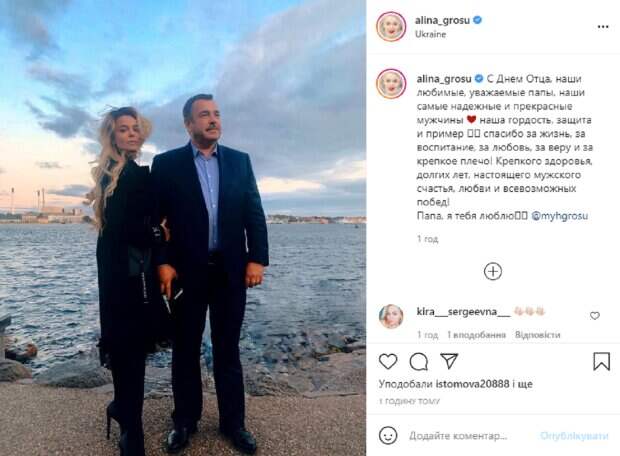 Так, в этот раз звездная красотка поделилась с поклонниками кадром, на котором позирует со своим любимым папочкой. На новом фото Алина с отцом Михаилом позирует в удивительной локации у огромного водоема. Перед камерой красотка появилась в элегантном черном наряде с туфельками на высоких шпильках. Ее волосы распущены и растрепаны ветром, а на лице легкий макияж. Певица взяла под руку любимого папочку, который тоже нарядный – он в темном костюме с голубой рубашкой. В подписи к фотографии Гросу написала: "С Днем Отца, наши любимые, уважаемые папы, наши самые надежные и прекрасные мужчины. Наша гордость, защита и пример. Спасибо за жизнь, за воспитание, за любовь, за веру и за крепкое плечо! Крепкого здоровья, долгих лет, настоящего мужского счастья, любви и всевозможных побед! Папа, я тебя люблю". Пользователи не остались равнодушны и тут же принялись комментировать фото Алины, присоединяясь к поздравлениям. Напомним, Гросу в распахнутом платье пообещала украинцам невероятный сюрприз: "Будет горячо и жарко". Как сообщала Politeka, Разведенная Гросу в кружевном черном платье вскружила головы мужчин: "Эталон женственности". Также Politeka, Разведенная Алина Гросу впервые разоткровенничалась о новом возлюбленном: "Он спас меня. ..".