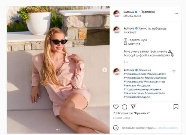 Девушка была на улице и нежилась в лучах солнца, хвастаясь роскошными формами. Об этом пишет Politeka.net со ссылкокй на страничку знаменитости. На втором снимке Татьяна уже была в цветной пижаме. Девушка в руках держала собаку, а рукой взялась за талию. "Какую ты выберешь пижаму? Однотонную Цветную Мне очень важно твое мнение", - написала звезда под фото. Фанаты поставили более 7 тысяч лайков и написали комментарии: "Шикарные ноги Татьяна, соблазнительная леди", "Мне очень понравилась первый вариант,"однотонная пижама", "Оглушающая", "Вы выглядите просто великолепно, фотографии получились такие милые", "Роскошная девушка, Танюша ты прекрасна, любую вещь украшаешь!!!". Мы писали, что бывшая солистка группы ВИА-Гра Татьяна Котова похвасталась идеальным прессом в коротком топе. На фото Котова позирует в спортивном образе во всем белом. На ней спортивные штаны, идеально обтягивающие формы красотки, свободный белый жилет и коротенький топ. Напомним, раскрепощенная экс-ВИА Гра вспомнила детство и засмущала узелком на бюсте А еще Politeka писала, что длинноногая звезда "ВИА Гры" разлеглась в кровати в чем мать родила Также Politeka сообщала, что горячая экс-ВИА Гра Котова примерила образ Шерон Стоун, широко расставив ноги