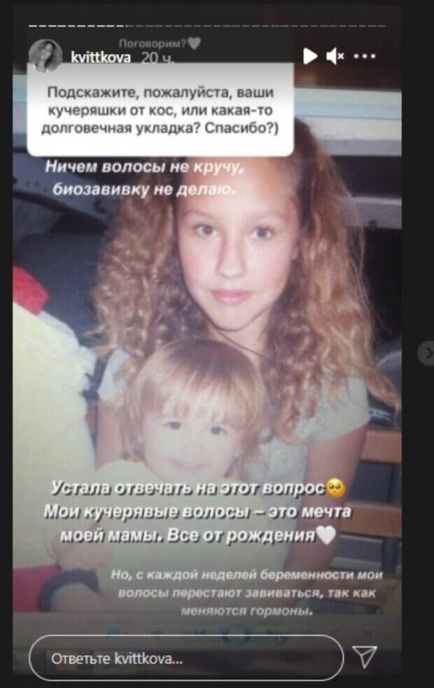 "Подскажите, пожалуйста, ваши кучеряшки от кос или какая-то долговечная укладка?", - спросили у жены Добрынина. "Устала отвечать на этот вопрос. Ничем волосы не кручу, биозавивку не делаю, - немного резковато ответила Даша, добавив, - Мои кучерявые волосы - это мечта моей мамы. Все от рождения. Но с каждой неделей беременности мои волосы перестают завиваться, так как меняются гормоны". В доказательство Квиткова прикрепила архивное фото, на котором предстала совсем еще крошкой на руках у белокурой девушки, похожей на нее сейчас как две капли воды. Оказывается, эта девушка - мама Даши. Просто невероятное сходство, что сразу бросается в глаза. К слову, на фото ниже сама Даша - у них с мамой реально одно лицо. Ранее мы сообщали, Квиткова поделилась бэкстейджем одной из фотосессий, показав, как выглядит без фильтров. Улыбающаяся жена Добрынина, с распущенными волосами, позировала в боди телесного оттенка, накинув на плечи мужской пиджак серого цвета. Девушка не стесняется показывать свой беременный животик, наоборот, хочет запечатлеть каждую секунду своего интересного положения. Недавно пара раскрыла, что у них будет сын. Напомним, беременная жена "Холостяка" Добрынина задрала майку, показав новую фигуру: "Сегодня ночью. .." Как сообщала Politeka, "Холостяк" Добрынин показал беременную жену в неожиданном образе: "Просто уникальный момент!" Также Politeka писала, что "Холостячка" Мишина показала экстремальные развлечения на отдыхе с Эллертом: "Не каждая осмелится"