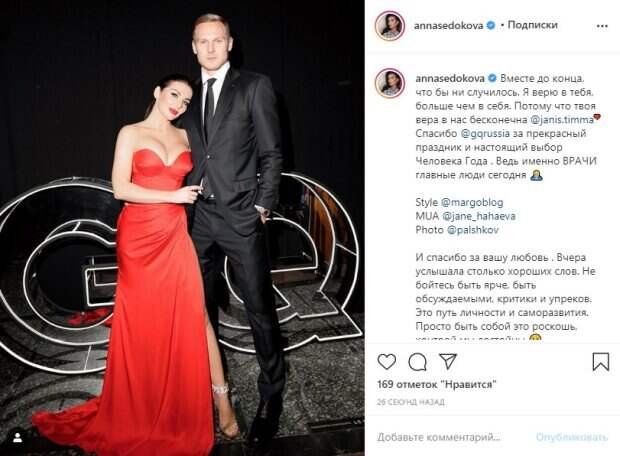 Рядом с ней, в строгом деловом костюме ее муж – Янис Тимма, латвийский баскетболист, который сейчас играет на позициях атакующего защитника в команде "Химки" (Подмосковье, РФ). Пара поженилась 6 сентября этого года, но сообщила о радостном событии лишь через две недели. "Вместе до конца, что бы ни случилось. Я верю в тебя, больше чем в себя. Потому что твоя вера в нас бесконечна ❤️ Спасибо @gqrussia за прекрасный праздник и настоящий выбор Человека Года. Ведь именно ВРАЧИ главные люди сегодня