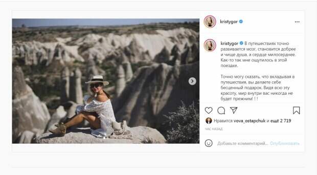 Сейчас новые супруги вместе активно проводят время, в частности, путешествуют, но в этот раз Кристина оставила мужа. На новых кадрах в своем Инстаграм Горняк похвасталась стройными ножками, когда ветер немного задрал ей платье. Звезда обула ботинки, а дополнила образ летними аксессуарами. Красотка присела на камень, впечатляя не только красивыми видами, но и внешностью. В публикации жена телеведущего рассказала, что думает о путешевиях. По ее словам, поездки увеличивают кругозор и очищают душу. "В путешествиях точно развивается мозг, становится добрее и чище душа, а сердце милосерднее. Как-то так мне ощутилось в этой поездке. Точно могу сказать, что вкладывая в путешествия, вы делаете себе бесценный подарок. Видя всю эту красоту, мир внутри вас никогда не будет прежним!!! Посидеть на вершине Долины Любви, подышать этим мощным воздухом-done!", - написала Кристина. "Но едь уже домой, скучаю