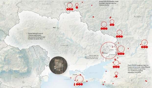 Войска России окружили Украину с трех сторон, в частности в районе легкой досягаемости Киева. Об этом накануне сообщил The New York Times, опубликовав соответствующую карту. Так, с начала 2022 года Россия перебросила в районы близ Луганска и Донецка еще пять батальонных тактических групп, в том числе пять тысяч военных для усиления позиций, дислоцированных сил.