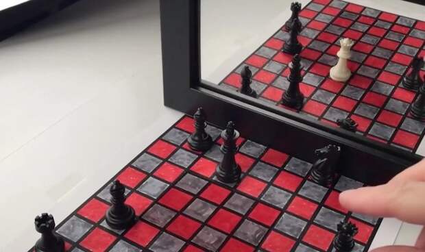 Такого рода иллюзии показывают зрителю картинку, которая остается искаженной, пока на нее не посмотрят под каким-то определенным углом. В данном случае зеркало рождает сложный двусторонний эффект: ферзь на доске выступает в отражении как бы из ниоткуда.
