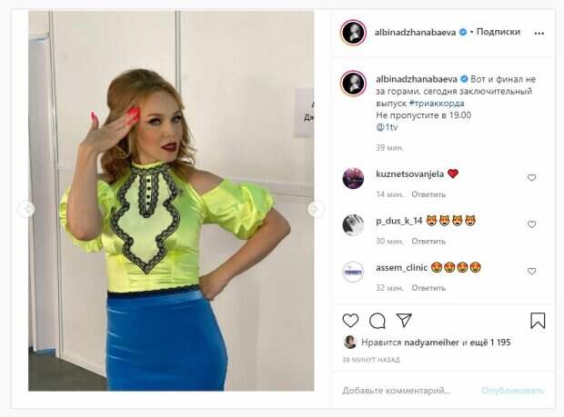 Об этом пишет Politeka.net со ссылкой на страничку знаменитости. "Вот и финал не за горами, сегодня заключительный выпуск", - написала Джанабаева. Фанаты поставили более тысячи лайков и написали комментарии: "Такие классные образы всегда-просто балдёж. Не устаю восхищаться вашей красотой", "Ой, этот образ взрослит, макияж, костюм....", "Макияж увы старит!", "Извините, вы не очень", "Надеемся на все тузы.Но даже если этого и не будет,то Вы все равно лучшая", "Красотка, как бы вам было красиво в наших изделиях", "Как всегда, красива" Сообщалось, что российская артистка Альбина Джанабаева выступила вместе с мужем Валерием Меладзе на дне рождения популярного московского ресторана. На фото видно, что публика не заморачивалась масками, несмотря на то, что в Москве ежесуточно фиксируют тысячи новых больных китайским вирусом. Поклонники подошли максимально близко к сцене, снимая артистов на телефоны. Ни о какой социальной дистанции речи тоже не шло. Напомним, Меладзе плюнул на все и признался, как изменял жене с Джанабаевой А еще Politeka сообщала, что Седокова рассказала о поцелуе с Меладзе, который в итоге женился на Джанабаевой Также Politeka писала, что Меладзе не смог утаить чувств к "темненькой" из его новой ВИА Гры, в Сети делают ставки