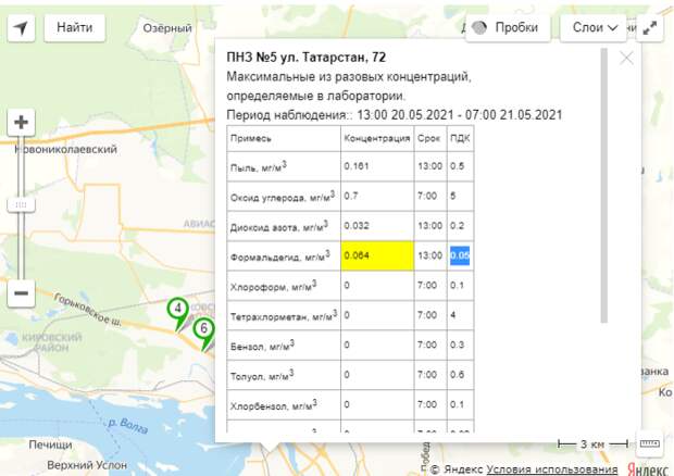 064 мг/куб. метр при норме в 0.05 мг/куб. метр. скриншот Данные представлены за период наблюдения с 13:00 20 мая по 07:00 21 мая.