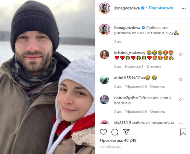 Супруг не придумал ничего лучше, как поднять Гвоздевой настроение после болезни (у нее был китайским вирусом), написав ее имя на льду. Мужчина вышел на реку и, оставляя следы на изморози, довел дело все же до конца. "Зая, спасибо! Главное, чтобы ты не провалился в конце!", - кричала ему вслед Илона. В какой-то момент девушка не на шутку запереживала. "О, господи, как оно хрустит все, и трещит! Вылазь оттуда бегом! Уже не нужна мне твоя любовь, такая...", - силилась придать своему голосу угрожающих ноток Гвоздева. Но, в итоге, все остались живы и здоровы, а звезда "Танців з зірками" получила такой необычный романтический подарок от любимого. "Любовь это - рисовать ее имя на тонком льду