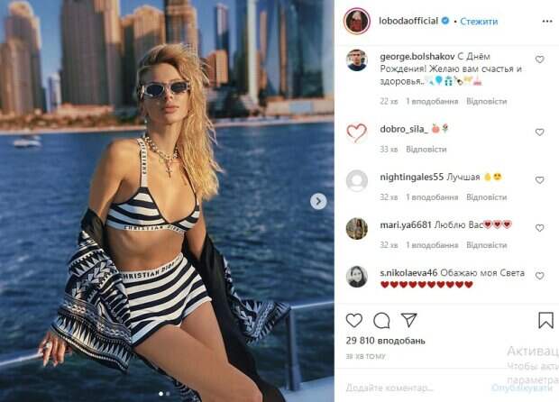 Это стало причиной бурной реакции со стороны ее поклонников. «Все напоказ! Дети же смотрят! Я вот своей запрещаю такое смотреть рано еще», «Зачем так сильно вытягивать ноги!!?», «королева красоты», «обалденная фигура», «так стильно», «лучшая», «обожаю вашу фигуру, Света», - пишут они. Как сообщалось до этого, певица Светлана Лобода сразила наповал откровенным снимком в честь дня рождения и намеком на свадьбу На фото певица позировала в прозрачном лифчике, через который просматривалась ее грудь. Но особое внимание пользователей сети привлекло кольцо Лободы на безымянном пальце и многозначительная фраза, посвященная тайному мужчине. Пост артистки вызвал бурную реакцию в сети. Поклонники стали расспрашивать артистку о предстоящей свадьбе. Напомним, что внешность младшей дочери Светланы Лободы вызвала переполох: "Почему синяки...". Как сообщала Politeka, сияющая Лобода залезла в ванну и показала лишнее в тонком лифчике: "Монро нашего времени". Также Politeka писала, что Лобода в облегающем наряде и очках внезапно нагрянула в Киев: "Терминатор".