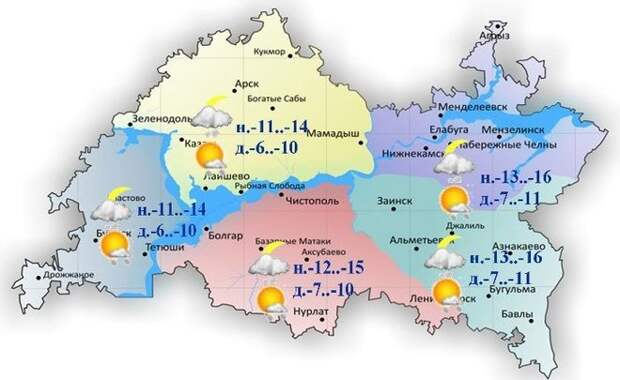 В среду, 24 ноября, в Татарстане прогнозируется облачная погода с прояснениями. Местами небольшой снег. Ветер западный, юго-западный умеренный, сообщается на сайте Гидрометцентра РТ. Максимальная температура воздуха днем составит -6... -11 градусов. В Казани ожидается от -6 до -10 градусов. В Набережных Челнах синоптики прогнозируют от -7 до -11 градусов.