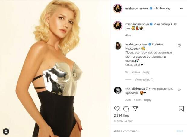 На снимке отчетливо видно, что под ним у знаменитости нет бюстгальтера, что придает образу пикантного шарма. Девушка позирует на камеру с томным взглядом, поглаживая свои бедра. Для съемки Миша Романова также сделала себе пышную прическу с завивкой. Пользователи социальной сети оценили внешний вид звезды и оставили много позитивных комментариев под фото: "Миииша, с Днём Рождения!!!! Ты нереальная красавица и талант, я желаю тебе бесконечной удачи, гармонии в душе, творческой энергии и новых высот!!!! ❤️❤️❤️"; "Прекрасный возраст для девочки, когда красивая и уже мудрая по жизни из-за полученного опыта)))"; "Мишкаааа с днём рождения 💛 свети и сияй, королева 🔥"; "Милая красавица!!! 😍 Поздравляем с днем рождения!!! Будь самой любимой и самой счастливой!!!"; "С днём рождения !!! Выглядишь на 18 👍👍👍". Напомним, что Миша Романова устроила смелую фотосессию топлес: чувственное фото. А еще Politeka писала, что Миша Романова, скрывавшая рождение ребенка, потрясла фото из роддома: "Будто другой человек". Также Politeka сообщала, что Миша Романова и Макс Барских наконец показали свои чувства: "Мутят, как Потап с Каменских".