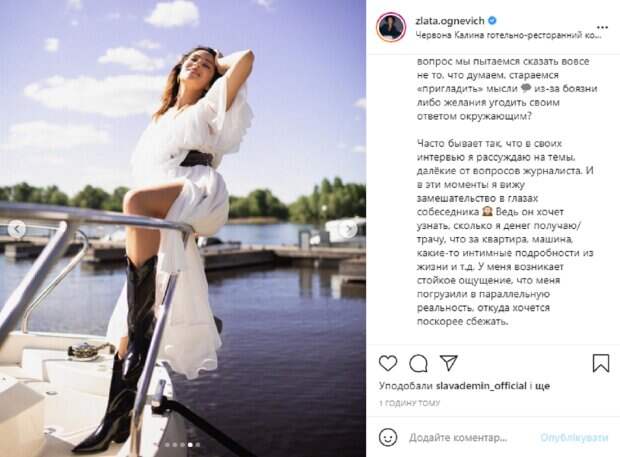 Буквально на днях стартовали съемки реалити с участием артистки, и у нее даже появился фаворит, после первой вечеринки с женихами. Теперь же в своем микроблоге в Instagram артистка поделилась результатами новой необычной фотосессии, а в подписи к публикации затронула важную тему. На новых снимках Злата позирует на яхте в одном из ресторанных комплексов. Перед камерой она появилась в необычном образе – на ней белоснежное платье интересного фасона, которое она дополнила черным поясом и лакированными сапогами. Этот наряд красиво подчеркнул идеальную фигуру и стройные ножки красотки. Ее волосы распущены и небрежно уложены, а на лице легкий макияж. В подписи к фотографиям Огневич поделилась сокровенным: "Где мы настоящие? В общении с друзьями, обществе или наедине с мыслями и отражением в зеркале? Часто бывает так, что в своих интервью я рассуждаю на темы, далёкие от вопросов журналиста. И в эти моменты я вижу замешательство в глазах собеседника. Ведь он хочет узнать, сколько я денег получаю/трачу, что за квартира, машина, какие-то интимные подробности из жизни и т.д. У меня возникает стойкое ощущение, что меня погрузили в параллельную реальность, откуда хочется поскорее сбежать". Напомним, У Огневич появился фаворит на "Холостячке", удивил на первом же свидании: "Приоткрою секрет. .." Как сообщала Politeka, "Холостячки" Ксения Мишина и Огневич, приспустив наряды, устроили битву взглядов: "Не превзойти...". Также Politeka писала, "Холостячка" Огневич выбрала для съемок первого эфира провальный образ: "Просто отвратительное платье".