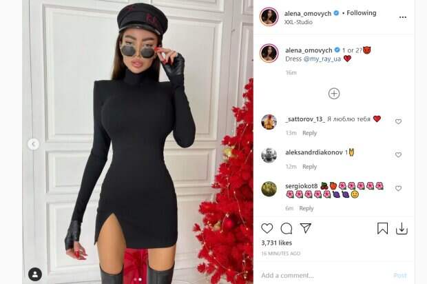 Образ дополнили кожаные перчатки, шоферская кепка, темные очки в серебристой оправе и сапоги на высоких каблуках. Она добавила яркие нотки при помощи красного маникюра. На одном из фото Алена Омович позирует возле алой новогодней елки, горделиво поправляя очки с чуть приоткрытыми губами. Вызывающий дизайн платья сделал акцент на ее стройных бедрах. На другом снимке модель села на корточки, широко расставив ноги. Она сфотографировала себя в зеркале, повернувшись к нему пятой точкой. Внешний вид привел в восторг пользователей соцсети, которые расщедрились на оценки в комментариях: "Тебе очень идёт
