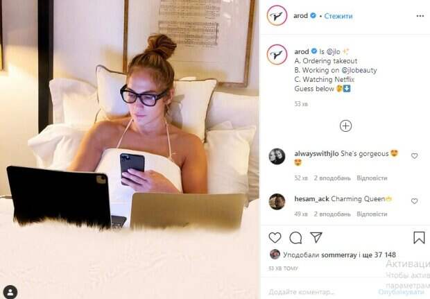 51-летняя голливудская звезда Дженнифер Лопес впечатлила поклонников, показавшись в «домашнем» образе в кровати Как рассказывает Politeka, фотография была опубликована на фан-странице знаменитости в Instagram. Так, певица позирует, умостившись на кровати перед ноутбуком и планшетом. Джей Ло что-то активно печатает, держа в руке телефон.