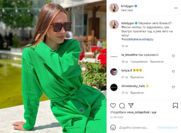 Теперь же, судя по фото в соцсетях, Вова счастлив в браке с новой возлюбленной. Недавно в своем микроблоге Кристина показала яркое фото с прогулки, на котором появилась в ярком весеннем образе. Как видно, девушка запечатлена на летней веранде среди цветов, она как будто о чем-то задумалась. На прогулку Горняк вышла в стильном и даже "сочном" зеленом наряде, который скрыл прелести, но подчеркнул фигурку. При этом в комментариях у жены Остапчука спрашиваю, что это на ней – платье или комбинезон. Волосы красотки распущены и чуть растрепаны ветром, а на лице легкий макияж и огромные солнцезащитные очки. В подписи к фотографии Кристина написала: "Неужели лето близко?! Если честно, то задумалась, как быстро пролетел год, а уже лето на носу!". Пользователи тут же принялись обсуждать новое фото девушки: "Как красиво!", "Время быстро летит", "Что на вас такое красивое и сочное? Это платье?", "Да, время летит нереально быстро", "Какой цвет. Огонь. И вам очень к лицу", "Какая вы красивая?", "Это платье или комбинезон". Напомним, Жена Остапчука призналась в своей зависимости, вызвав ажиотаж: "Привет, я Кристина, и я...." Как сообщала Politeka, Остапчуки предались утехам возле бассейна, кадры с жаркого курорта: "Много поцелуев…". Также Politeka писала, Жена Остапчука, рванувшая в Египет без мужа, поразила новыми кадрами: "Как они делают это на жаре?".