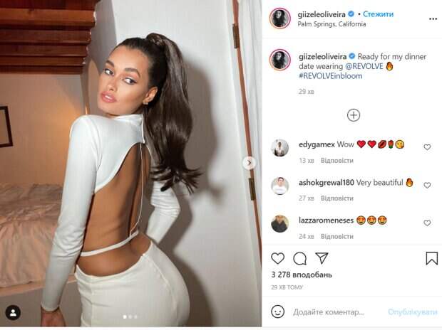 Оно с длинными рукавами, однако при этом очень короткое, и у него есть пикантные вырезы на боках. Кроме того, спина на платье - полностью открыта, поэтому фото сзади получилось особенно эффектным. "Готова к своему обеденному свиданию", - написала она. Свой образ эффектная модель дополнила высоким "конским" хвостом и ярким макияжем. В комментариях фолловеры модели не сдерживают эмоций, засыпая ее комплиментами. "Твое платье очень красивое, хорошо смотрится на тебе", "Вау", "Невероятная красота", "Ты очень горячая", "Я в восторге", "Сенсационная", "Потрясающая горячая особа", - пишут в комментариях. Следует отметить, что параметры бразильской фигуры Жизель являются образцом модельной фигуры в Латинской Америке. Раскосые и чуть восточные глаза создают общую атмосферность привлекательности фотомодели не только в США и Европе. Напомним, бразильская красотка из Victoria's Secret сняла кофточку и показала упругое тело со всех сторон Также Politeka сообщала, что звезда-красавица Victoria's Secret приспустила джинсы, блеснув красотой посреди улицы А еще Politeka писала, что бразильская звезда Victoria's Secret задрала кофточку, засветив сладкие места