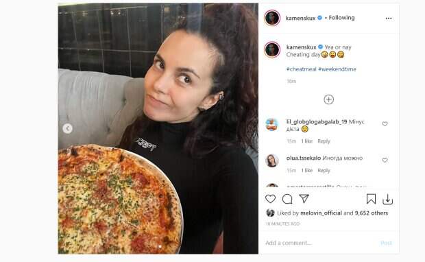 Настя Каменских предстала на снимке в черной обтягивающей водолазке, которая спрятала ее формы от любопытных глаз. Жена рэпера Потапа сделала себе роскошную прическу и легкий неброский макияж, а также украсила уши металлическими сережками. Сидя на диване в зале ресторана, исполнительница показала поднос с пиццей, которую собралась съесть во время перерыва в диете. На одном из фото красотка задумалась, а стоит ли баловать себя таким количеством калорий, однако потом сдалась. "Да или нет? Разгрузочный день