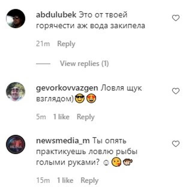 Она соблазнительно наклонилась, оттопырив пятую точку, коснулась водной глади своими пальцами, и вдобавок "стрельнула" обворожительным взглядом, от которого просто мурашки по телу. Образ также выделяется роскошным декольте, которое Ольга в этот раз прикрыла рукой. Пользователи социальной сети в комментариях написали в адрес Серябкиной много приятных комплиментов и сравнений: "Это от твоей горячести аж вода закипела"; "Ловля щук взглядом)