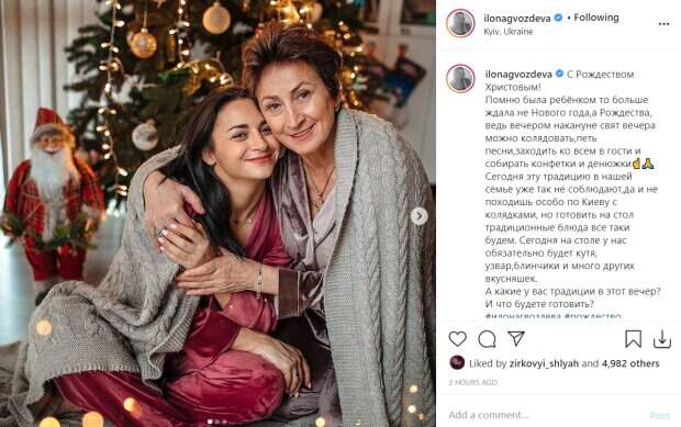 На одном из снимков Илона Гвоздева запечатлена в красной бархатной пижаме, обнимаясь с мамой под вязанным пледом на фоне елки. Вероятно, родственница нанесла визит с самого утра. На другом снимке бабушка взяла маленького внука на руки возле той же елки, а Илона уже успела переодеться и нежно прижалась к ней сзади. На последнем кадре Гвоздева обняла своего мужа и приложилась к нему лбом, пока их старшая дочь сидит рядом за украшенным столом. "С Рождеством Христовым! Помню, была ребёнком, то больше ждала не Нового года, а Рождества, ведь вечером накануне свят вечера можно колядовать, петь песни, заходить ко всем в гости и собирать конфетки и денюжки ☝️