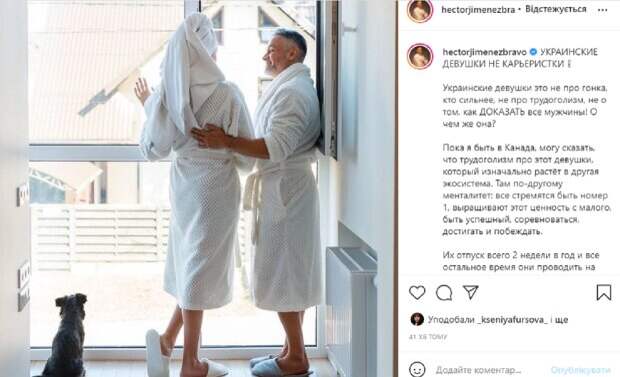 На фотографии Эктор и его компаньонка стоят у огромного панорамного окна, то ли в квартире, то ли в отеле. Перед камерой оба появились в уютных белых халатах, а у девушки еще и полотенце на голове. Она стоит спиной к камере и смотрит в окно, а Эктор любуется ею. В подписи к фото Хименес-Браво поделился своими рассуждениями и сравнил канадских и украинских женщин: "Украинские девушки – это не про гонку, кто сильнее, не про трудоголизм, не о том, как доказать всем мужчинам! О чем же они? Пока я был в Канаде, могу сказать, что трудоголизм этих девушек изначально растёт в другой экосистеме. Там другой менталитет: все стремятся быть номер 1, выращивают эту ценность с малого, быть успешней, соревнуйся, достигай и побеждай. Украинки уже идеальны. Уже прекрасны. У них идеальный баланс работа-семья, и очень важно то, что они пример настоящей женской роли, какой должна быть женщина". Напомним, Эктор Хименес-Браво сообщил о письмах с угрозами: "Я не даю второй шанс". Как сообщала Politeka, Хименес-Браво из "Мастер Шеф" в эффектном костюме заставил украинок пофантазировать: "У себя под домом...". Также Politeka писала, что Хименес-Браво нарвался на жесткую критику из-за бесстыжего фото: "Куда катятся эти звезды. ..".