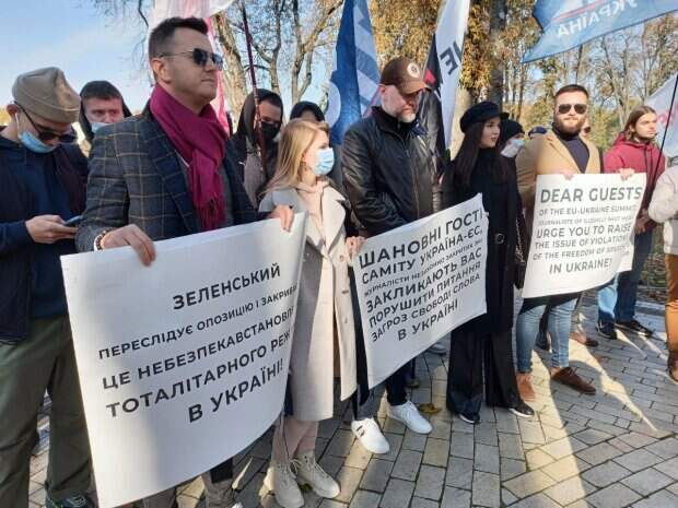 Сотрудники независимых украинских медиа "112 Украина", NewsOne, ZIK, "Перший Незалежний", в день саммита "Украина - ЕС" масштабную акцию с целью привлечь внимание гостей саммита Украина-ЕС к нарушению свободы слова в Украине. Представители незаконно закрытых президентом Владимиром Зеленским медиа расположились на нескольких локациях: вдоль Бориспольского шоссе и в Мариинском парке, пишет 112ua.