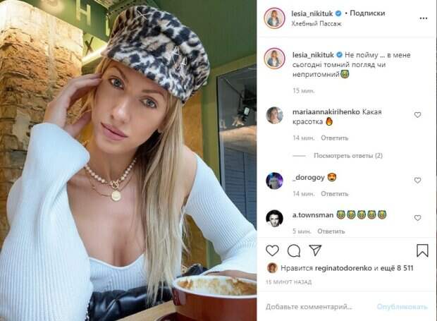 Сегодня Леся не изменила себе, для нового кадра в соцсети она нарядилась в белый свитер, который буквально сполз с ее плеч и почти обнажила бюст знаменитости. На голову Никитюк надела кепку со "звериным" принтом, шею украсила бусами и золотым кулоном на цепочке. "Не пойму ... в мене сьогодні томний погляд чи непритомний