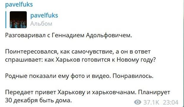 Близкий друг Геннадия Кернеса официально подтвердил, что мэр скоро будет в Харькове Об этом Павел Фукс сообщил в своем телеграм-канале. «Разговаривал с Геннадием Адольфовичем. Поинтересовался, как самочувствие, а он в ответ спрашивает: как Харьков готовится к Новому году? Родные показали ему фото и видео.