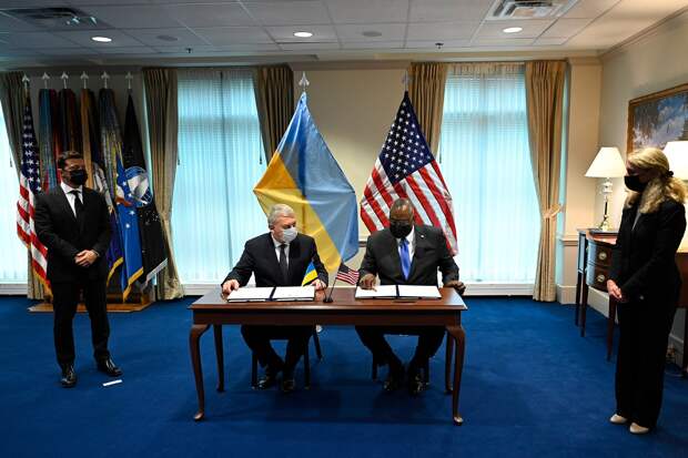 В Пентагоне подписано соглашение о стратегических основах оборонного партнерства. Для нас очень важна поддержка со стороны США территориальной целостности Украины, членства в NATO и совместное противодействие агрессии РФ", - отметил Зеленский. Судя по фото, которое показал украинский президент, документ с украинской стороны подписал министр обороны Андрей Таран, с американской - министр обороны Ллойд Остин.