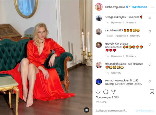 Так, Дарья устроила предновогоднюю фотосессию с ретро-мебелью, играющим патефоном и зажженными свечами. В видео как раз бэкстейдж этой съемки. Особенно Трегубова впечатлила образом в красном шелковом платье. Девушка предварительно разбулась и избавилась от бюстгальтера: образ вышел куда сочнее и притягательнее. Дарья покрутилась в таком виде перед камерой, показав себя с разных сторон - казалось, что ей вовсе неведомо смущение, так раскованно она себя чувствовала. В довершении, ведущая раскинулась на зеленой софе в томной позе. Пользователи с восторгом кинулись обсуждать увиденное. Правда, один из комментирующих указал, якобы на изъян, - слишком бледную кожу. "Как всегда, великолепна!