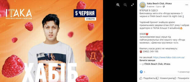 В Одессе хочет дать концерт российский певец, до этого развлекавший публику на оккупированных территориях, однако не всё так просто Бывший полицейский Хабиб Шарипов, который начал карьеру поп-певца и прославился треком "Ягода малинка", надумал приехать на гастроли в Одессу. Однако на него обратил внимание активист Сергей Стерненко, и напомнил о концертах данного певца в оккупированном Донецке и Крыму, после чего продажа билетов была срочно приостановлена.