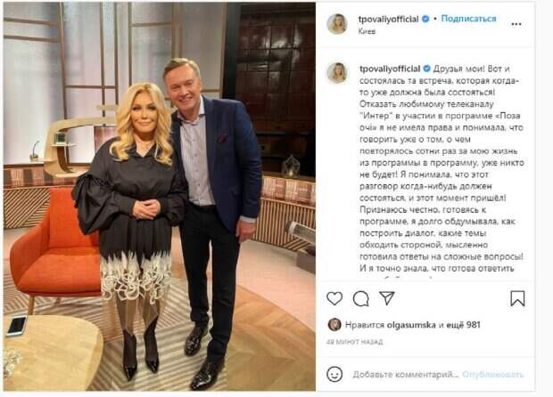 В новой публикации в Инстаграм Таисия рассказала, об интервью, которое дала телеканалу "Интер": "Друзья мои! Вот и состоялась та встреча, которая когда-то уже должна была состояться! Отказать любимому телеканалу "Интер" в участии в программе «Поза очі» я не имела права и понимала, что говорить уже о том, о чем повторялось сотни раз за мою жизнь из программы в программу, уже никто не будет! Я понимала, что этот разговор когда-нибудь должен состояться, и этот момент пришёл! Признаюсь честно, готовясь к программе, я долго обдумывала, как построить диалог, какие темы обходить стороной, мысленно готовила ответы на сложные вопросы! И я точно знала, что готова ответить на любой из них! Но есть одна тема, которую я бы побоялась хоть когда- нибудь в жизни поднимать! И я совершенно не готовилась! Правда, я о ней постоянно думала и знала что когда-нибудь, не скоро…, я напишу большую книгу! Но Вселенная подсказала правильный путь! В день интервью я была как будто в прострации. Я не могла ни о чем думать, кроме как о том, какой длины накрасить стрелку! И вот я в студии, всё как в другом мире происходит! Я держалась молодцом! Я себя хвалила за то, что Я ОЧЕНЬ СИЛЬНАЯ!!! Я вышла с программы с высоко поднятой головой! Ехала домой, тоже находясь в прострации! Но это Жизнь и Мы Должны ЕЕ ПРОЖИВАТЬ!!! Ничего, что я дома проплакала полночи, ничего, что я и сейчас пишу этот пост, и моя Душа плачет! И я знаю точно, что и это все пройдёт!! И будут Новые программы и Новые интервью! И будет Волшебство, как оно было в моей Жизни ВСЕГДА!!! Люблю Вас, мои дорогие подписчики! Всех люблю, независимо от того, любите Вы меня или нет! До встречи в эфире на телеканале "Интер"!", - написала Повалий. На фото Таисия была в платье с прозрачным низом. Звезда стояла рядом с неизвестным мужчиной в пиджаке. Фанаты поставили почти тысячу лайков и написали комментарии: "Вы сильная!!! Все наладится", "Когда выйдет передача?Вы так заинтриговали.......почему плачет душа... она должна радоваться!Пусть в Вашей жизни будет только любовь и счастье!!!", "Когда выйдет передача?Вы так заинтриговали.......почему плачет душа...она должна радоваться!Пусть в Вашей жизни будет только любовь и счастье!!!". Напомним, Таисия Повалий показала, как проводит время в России А еще Politeka писала, что Таисию Повалий разнесли за новую внешность Также Politeka сообщала, что Повалий забралась на крышу многоэтажки ради нового видео