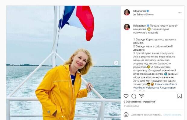 Девушка была тепло одета, ведь отдыхала на западном побережье Франции с дочерью. "Начала писать завещание потомкам. Первый пункт одолжила у классиков- 1. Всегда Пользоваться защитным кремом. 2. Всегда иметь с собой качественный дождевик 3. Третий пункт еще не придумала. Но в приложении точно будет перечень мест, где сначала незаметно сгораешь под легким бризом, как редисочка. А потом получаешь штормовку, потому плотный океанический ветер пронизывает до костей. Идеальные места для отдыха - я считаю. Хочу чтобы мои потомки тоже ездили только туда", - написала Лидия. Фанаты поставили почти 2 тысячи лайков и написали комментарии: "Красотка Лидия", "Люблю вас, Лида, но почему-то много чудных постов", "Какая ты красивая, Лида". Напомним, звезда "1+1" Таран показала, какой рослой красоткой стала ее дочь от Доманского А еще Politeka писала, что звезда "1+1" Лидия Таран в голубом топе впечатлила кадрами на природе Также Politeka сообщала, что звезда 1+1 Лидия Таран показала украинцам, как развлекается в отпуске