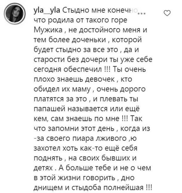 В новом после на своей странице Андрей Джеджула рассказал свою версию событий. Разъяснения он разместил на пяти страницах печатного текста и выложил в Сети. «Терпение лопнуло! Ответ на все выпады в СМИ в мой адрес! Полная Версия!» - отметил Джеджула. Андрей пишет, что долго молчал, сперва из-за беременности супруги, потом пока она кормила грудью. Кроме того, он был связан контрактом с госканалом. Но теперь контракт из-за скандала расторгнут и он решил ответить на публичные обвинения жены. «Юля – рвач, женщина, которая научилась выживать, но не за счет своих профессиональных навыков и умений, а за счет таких дураков, как я!», - пишет Джеджула. Он утверждает, что готовил для супруги и убирал дом всю беременность, и когда она болела ковидом, несмотря на постоянные оскорбления. При этом он еще и работал. «Как называется ситуация, в которой тебя каждый Божий день за исключением небольших перерывов оскорбляют? Унижают? Зная, что я не могу ответить, держусь, как могу! «Дебил, тварь», «Сдохни, тварь» - это ее любимое! «Чтоб тебя машина сбила! Ты мать свою в гроб загнал и скоро всех потеряешь! Ты будешь один! ЯЯ найду папу Адэличке!...», - приводит Андрей слова супруги. Объяснил Андрей и инцидент, когда Леус разыскивала полиция, мол, Джеджула не знал, где она делась с маленьким ребенком. Банковская карта Леус подвязана под его счет и в 2:30 ночи ему пришло сообщение, что Юля воспользовалась службой такси. На вопрос, с кем был ребенок, пока Леус где-то ездила, Андрей ответа не получил, поэтому обратился в милицию. Юлия не ответила откровения супруга без реакции. «Стыдно мне конечно, что родила от такого горе Мужика, не достойного меня и тем более доченьки, которой будет стыдно за все это , да и старости без дочери ты уже себе сегодня обеспечил!!! Ты очень плохо знаешь девочек, кто обидел их маму, очень дорого платятся за это, и плевать ты папашей называется или ещё кем, сам знаешь по мне!!! Так что запомни этот день, когда из-за своего пиара лживого, захотел хоть как-то ещё себя поднять, на своих бывших и детях. А больше тебе и не о чем в этой жизни говорить, дно днищем и стыдоба полнейшая!!!» - написала она. Пост активно комментируют пользователи Сети. «Боже, друзья разведитесь и не позорьтесь на всю страну», «Господи, вы ещё это терпите? Зажралась тёлка и качает нервы, найдите другую нормальную и адекватную жену», «Я не считаю ничего плохого в том, что Вы все рассказали. Юля же первая начала выносить сор из избы, а теперь когда очернила репутацию, что даже уволили, то терять нечего и можно тоже рассказать. Если все правда, что Вы говорили, то Вам цены нет», «Никого не оправдываю, всегда виноваты оба», - пишут в комментариях. Напомним, жена Джеджулы вместо сочувствия украинцев нарвалась на гнев: "Разводись, а не жалуйся" Как сообщала Politeka, Джеджула обрывает телефоны полиции после ухода жены с ребенком: "Почему психбольницы закрыли?" Также Politeka писала, что жена Джеджулы в слезах заявила об угрозах: "Что с этим идиотом делать?"