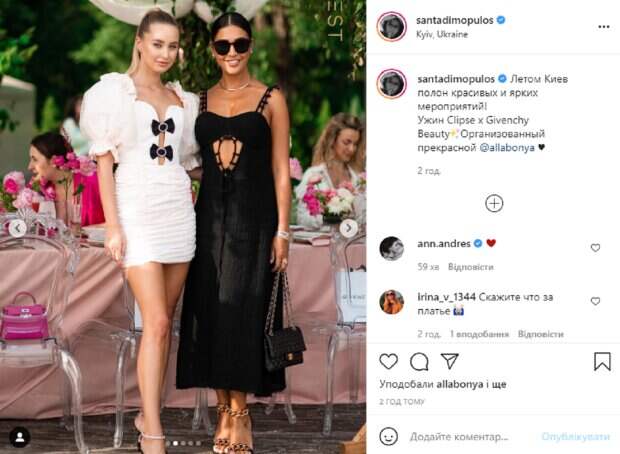 На новых снимках видно, что Санта выбрала для мероприятия сдержанное черное платье с интересным вырезом и тонкими бретельками, этот наряд красиво подчеркнул изящную фигуру красотки. Свой образ звезда дополнила стильными босоножками на шпильках и небольшой черной сумочкой. Волосы девушки собраны в элегантную прическу, а на ее лице модные солнцезащитные очки. В подписи к публикации Димопулос написала: "Летом Киев полон красивых и ярких мероприятий! Ужин Clipse x Givenchy Beauty. Организованный прекрасной @allabonya". Фанаты тут же кинулись комментировать новые фото Санты: "Ты очень красивая", "Красоточка", "Ну очень красивая", "Красавицы", "Сногсшибательно", "Какая красивая!", "Какая вы красивая, и платье огонь", "Идеальная". Напомним, Беда пришла в семью Димопулос из "Танців з зірками", пострадали дети: "Дома все посыпалось...". Как сообщала Politeka, Победительница "Танців з зірками" Димопулос в мини-бикини понежилась у водопада: "Какое блаженство". Также Politeka писала, Победительница "Танців з зірками" Димопулос раскрыла неприятное о коллегах по шоубизу: "Там поголовно все...".