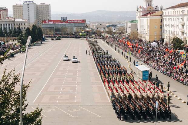 В параде участвовали легендарный танк Т-34 и современная техника, в том числе — новейший оперативно-тактический ракетный комплекс «ИСКАНДЕР-М». Глава Бурятии Алексей Цыденов напомнил, что Россия на всех этапах противостояла любым трудностям, потому что российские народы действуют вместе, несмотря на разные языки и молитвы. Он подчеркнул, что Бурятия внесла значимый вклад в Великую Победу, а высших военных званий удостоены 58 Героев Советского Союза и России и 12 кавалеров Ордена Славы из Бурятии. «Будем достойными ратных и трудовых подвигов ветеранов и тружеников тыла, будем достойными мужества и стойкости наших воинов, которые сегодня на передовой. Сохраним самое ценное, что завоевано в 45-м — мир, свободу, независимость нашей великой страны. Пусть праздник Победы служит и впредь единению нашего народа, и придаст новые силы в укреплении могущества России», — сказал Цыденов. В одном строю с российскими военными частями прошли военнослужащие из братской Монголии. Цыденов напомнил, что когда японские милитаристы напали на Монголию, Советский Союз пришел на помощь и в боях на Халхин-Голе помог отстоять независимость и целостность Монголии. А когда Германия напала на СССР, Монголия первой встала рядом плечом к плечу, и поставки монгольским народом продовольствия, одежды, средств на вооружение внесли существенный вклад в общую Победу. «Мы помним и отдаем должное помощи Монголии в борьбе с общим врагом. Сегодня злые силы хотят переписать историю, обманом и ложью хотят сбить с истинного пути нашу молодежь. Наша задача не допустить этого. Сохранить память, историю и дружбу между нашими народами», — подчеркнул Цыденов. Среди приглашенных ветеранов парад Победы принимала реальный участник боев на Халхин Голе Цэрэнгийн Чимэдцэрэ, которая в 1939 году пятнадцатилетней девушкой пошла медсестрой на передовую. Она приехала в Бурятию из Монголии специально, чтобы почтить память советских солдат-освободителей. Присутствовавшие почтили память павших за свободу и независимость Родины минутой молчания. Временно исполняющий обязанности командующего 36-й общевойсковой Армии полковник Игорь Сокол, выступая перед участниками и зрителями парада, подчеркнул, что у народа нет права забыть горе и страдания, принесенные фашизмом. Он отметил важность передачи из поколения в поколение истории военных лет: «Это нужно, чтобы память о днях, опаленных огнем, жила не только в наших сердцах, но и в сердцах наших детей. Поэтому сегодня весь наш многонациональный народ снова объединился в борьбе с нацизмом. И наши земляки делом показывают свое мужество, отвагу и любовь к Родине», — подчеркнул Сокол.