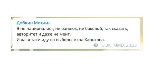 Михаил Добкин подтвердил свое намерение баллотироваться в мэры Харькова Такое заявление бывший мэр разместил на своем Telegram-канале. "Я не националист, не бандюк, не боковой, так сказать, авторитет и даже не мент. И да, я таки иду на выборы мэра Харькова", - написал Добкин. Таким образом он ответил министру МВД Арсену Авакову, который 5 января,провел совещание в ХОГА и заявил, что в Харькове "никакие националисты, никакие бандюки, никакие боковые авторитеты не будут решать и править", (чтобы посмотреть видео - перейдите по ссылке).