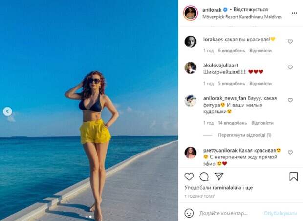 Так, недавно звездная красотка выложила в сторис кадры на борту самолета, а теперь показала соблазнительные фото с мальдивской набережной. На новых фото Ани запечатлена, стоя босыми ногами на пирсе, а за ее спиной открывается потрясающий океанический пейзаж. Перед камерой она появилась в соблазнительном образе – на ней коротенькие желтые шорты и темный лифчик от купальника. Этот наряд красиво подчеркнул идеальную фигуру 42-летней звезды, которой могут позавидовать даже молодые девушки. Поклонники заметили, что Лорак новая прическа – ее волосы в мелких кудряшках, а на лице стильные солнцезащитные очки, она смотрит прямо в объектив. В подписи к фотографиям артистка рассказала о турагенте, которая организовала ее отдых на райских островах. "Мы второй день на острове, а я уже впечатлена и открываю для себя новых друзей. В этом путешествии нам очень помогла Марина @marina.maldives – эксперт по Мальдивам и хозяйка ведущей принимающей туристической компании!", - написала Лорак. А поклонники принялись обсуждать ее новых фото, засыпая комплиментами в комментариях к публикации. "Какая вы красивая!", "Шикарная", "Вау, какая фигура. И ваши милые кудряшки", "Какая красивая. С нетерпением жду прямой эфир! ", "Какая вы красивая и совсем юная", - пишут в комментариях к фото. Напомним, 42-летняя фигуристая певица Ани Лорак впечатлила фанатов дерзким образом в красном: "Что же мучаете нас?". Как сообщала Politeka, 42-летняя певица Ани Лорак счастлива и больше не одинока, фото нежностей попали в сеть: "Мой защитник". Также Politeka писала, Любовница бывшего мужа певицы Ани Лорак пококетничала перед камерой в костюме зайки: Мурат не смог устоять.
