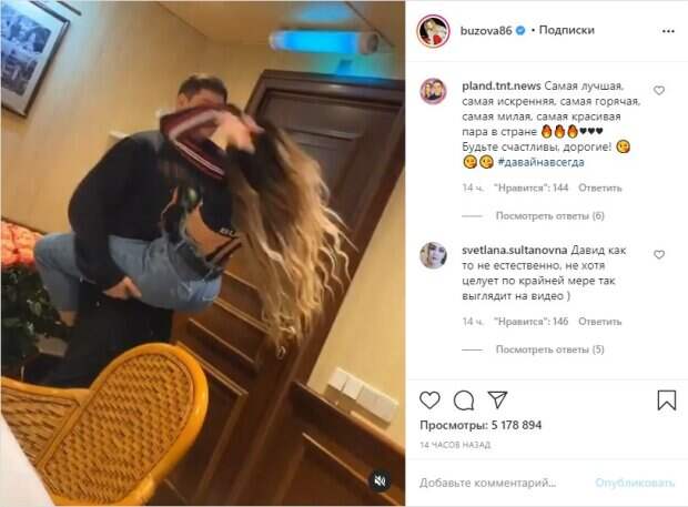 34-летняя российская певица, блогерша и звезда "Дом-2" Ольга Бузова поделилась в соцсети пикантным видео Как сообщает Politeka, ссылаясь на Инстаграм знаменитости, на кадрах Ольга резко запрыгнула на своего любовника Давида Манукяна, которого также знают как Дава и крепко обняла его. Затем влюбленные страстно поцеловались.