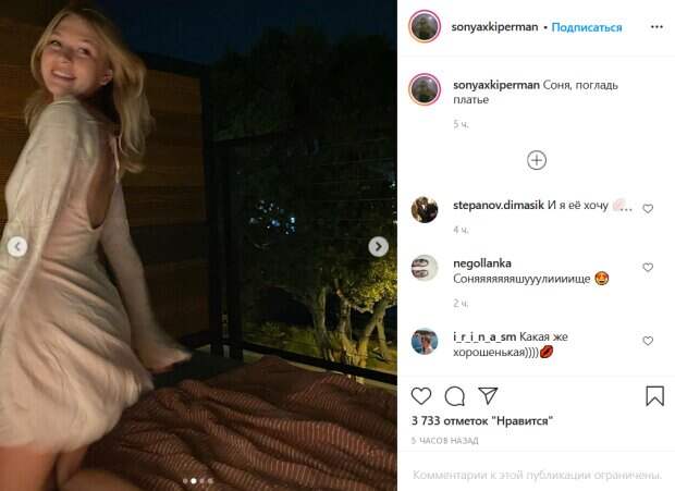 Юная красотка одета в короткое белое платье из «помятой» ткани с вырезом на спине. Девушка вовсю крутится перед камерой, явно получая удовольствие от этой домашней фотосессии. «Соня, погладь платье», - подписала снимки Киперман. В комментариях к снимкам отметилась мама красотки, которая в шутку ответила на ее подпись: «Вот как ты можешь, в мятом». Подписчики Сони также отреагировали на новый пост. «Шикарная», «Прекрасная барышня, просто мечта джентльмена», «Надо погладить платешко», «И так хороша», «Какая же хорошенькая», «Страстная Соня», «Мама все заметит», - пишут люди. Ранее мы писали, что Соня опубликовала серию фото, сделанных ночью. Красотка позировала на балконе в черном топе, который обтянул ее пышные формы. Она соблазнительно позировала на камеру, устроив любительскую ночную фотосессию. «Тьфу, как будто», - подписала снимки Соня. За несколько часов ее пост собрал более 4 тысяч лайков. Оценила фото и мама девушки, певица Вера Брежнева. В комментариях ей оставили массу комплиментов. Напомним, юная дочь Брежневой восхитила нежной красотой в пикантной блузке, мама оценила. Как сообщала Politeka, соблазнительная дочь Веры Брежневой в купальнике нагнулась слишком низко. Также Politeka писала, что юная дочь Веры Брежневой в тесном топе соблазнила ночными кадрами.