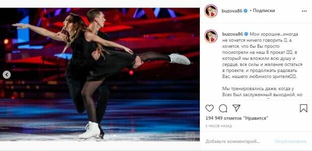 Звезда Ольга Бузова рассказала, почему фанатам стоит посмотреть ее новое выступление на "Ледниковом периоде" Откровенная публикация появилась в личном микроблоге певицы в Instagram. По словам звезды, в новый номер они с партнером Дмитрием Соловьевым вложили душу и сердце. "Мои хорошие...иногда не хочется ничего говорить, а хочется, что бы Вы просто посмотрели на наш 8 прокат, в который мы вложили всю душу и сердце, все силы и желание остаться в проекте, и продолжать радовать Вас, нашего любимого зрителя", - призналась Бузова и добавила, что они тренировались даже тогда, когда все отдыхали.