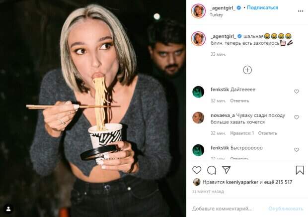 29-летняя телеведущая и блогерша Настя Ивлеева позабавила публику неожиданным кадром Как передает Politeka.net, звезда "Орла и решки" опубликовала в своем микроблоге в Инстаграм свежее фото, на котором предстала за трапезой. Так, Ивлеева в коротком шерстяном свитере и черных джинсах, при полном параде, с удовольствие уплетала длинную лапшу из бумажного стаканчика.
