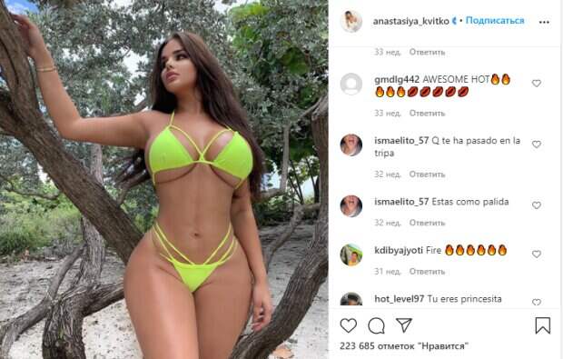 Теперь Настя старается показывать как можно больше дерзких кадров для привлечения внимания. Пикантное фото, на котором она позировала в салатовом купальнике с тонкими лямками, собрало несколько сотен комментариев. Многие были поражены образом Квитко, ведь девушка снова надела бикини не по размеру, посветив при этом пышным бюстом. Намерено примерив лифчик, который скрывает формы лишь от части, Настя добилась нужного эффекта – в сети отреагировали очень скандально на выходку модели. В сочетании с неестественно тонкой талией и крупными бедрами ее образ вышел очень необычным. «Вы носите все, что носите дома?; Я просто влюбился