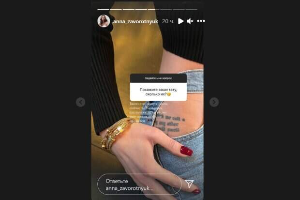 net. Дочка актрисы Анастасии Заворотнюк ответила на вопрос, который давно мучает ее поклонников: сколько татуировок на ее теле и может ли Анна их показать. Этот вопрос был поставлен довольно давно и модель все-таки решилась на него ответить и показать рисунки на своем теле настойчивым фанатам. На фото в Stories Анна Заворотнюк показала крупным планом свое бедро, проглядывающееся из-за оригинального кроя брюк, в которые была одета модель. Через прорези в тех местах, где обычно бывают карманы на джинсах, была видна яркая надпись английскими буквами, которую, по словам модели, она сделала еще в юном возрасте. Несмотря на то, что у Анны было два рисунка на теле, впоследствии она оставила только тот, который ей нравился, избавившись от второго. "Было две, одну я свела, сейчас только одна, сделала ее лет в 16, но мне до сих пор она нравится",- пишет дочь Заворотнюк у себя на странице. Стоит отметить, что Анна показала тату уже не в первый раз. Недавно она обновила страничку кадрами небольшой фотосессии, где она позировала в том же наряде. Через заметные прорези в тех же узких джинсах можно было заметить надпись на правом бедре девушки, которая немного просматривалась в кадре. Хотя подробности поклонники смогли узнать только сейчас. Напомним, дочь онкобольной Заворотнюк поведала о состоянии мамы и почему скрывают ее младшую сестру: "Очень тяжело..." Как сообщала Politeka, худющая дочь онкобольной Заворотнюк устроила пикантную фотосъемку в спальне: "Аж страшно..." Также Politeka писала, что у Жигунова и его жены-копии Заворотнюк пополнение в семье, появились кадры: "Добро пожаловать, малыш!"