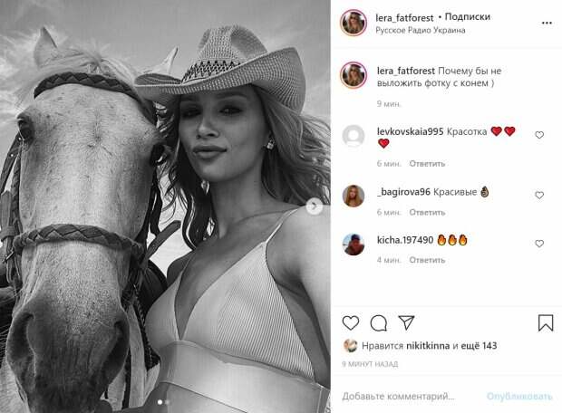 Образ юмористка дополнила легкой ковбойской шляпой. Лера также сделала яркий макияж с акцентом на глаза и надула губки, что придало образу еще больше игривости. "Почему бы не выложить фотку с конем )", — коротко и незамысловато подписала снимки актриса. "Хорошо но ЧБ круче)) а почему бы и нет, лошади иногда лучше людей", "Чуть помедленнее, кони, чуть помедленнее!