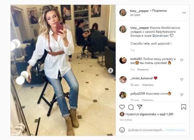 В этот раз Паперная опубликовала фото, где позировала в джинсах и блузе перед зеркалом с лампами. Девушка показывала эффектную укладку и свои светлые волосы. "Король бомбических укладок и самого безупречного блонда в мире Павел Ваан. Спасибо тебе ,мой дорогой!", - написала Тоня под фотографией. Фанаты поставили более тысячи лайков и написали комментарии: "Люблю вашу укладку и вас, вы очень красивая", "Королева стиля", "Вы прекрасна, гены дают результат все-таки". Мы писали, что старшая дочь украинской актрисы Ольги Сумской, артистка Антонина Паперная, прошлась по красной дорожке с любимым мужем. Так, 22 апреля пара прошлась по красной ковровой дорожке, в честь Московского международного кинофестиваля. Тоня надела черный брючный костюм, завершив образ утонченными украшениями, а ее муж также выглядел стильно в черном костюме с белоснежной рубашкой и галстуком. Напомним, старшая дочь Сумской удивила внешним видом после похода к парикмахеру А еще Politeka писала, что старшая дочь Сумской показала российского мужа, с которым осталась в Москве Также Politeka сообщала, что дочь Сумской после рождения второго ребенка насмешила универсальным советом