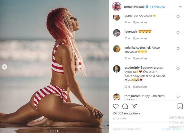 Обратим внимание, что на снимках Усманова позирует во время отдыха на море, демонстрируя идеальную фигуру в мокром купальнике. Это стало причиной бурных комментариев со стороны ее поклонников. «Какая сочная, смотреть можно бесконечно», «Восхитительная русалка🔥❤️ Счастья и благополучия тебе и вашей семье🤗🙏❤», «Господи, как же красиво», «Невероятная ❤️🔥 очень красивые и живые атмосферные фото», «Какая красивая», — пишут они. Как сообщалось ранее, фитнес-тренер Екатерина Усманова показала фигуру, не стесняясь никого. На фото Усманова позировала в желтом бикини на веревочках, развернувшись спиной к камере. Красотка оставила волосы распущенными и демонстрировала подтянутую пятую точку, которую она активно улучшала. Девушка ничего не прикрывала и не стеснялась показать результаты своего труда. Напомним, фитнес-тренер Усманова показала, как ее роскошное тело изменилось за 7 лет А еще Politeka сообщала, что влажная фитнес-тренер Усманова в крохотном купальнике показала самое сочное Также Politeka сообщала, что влажная фитнес-тренер Усманова эффектно задрала ножку в мини-бикини