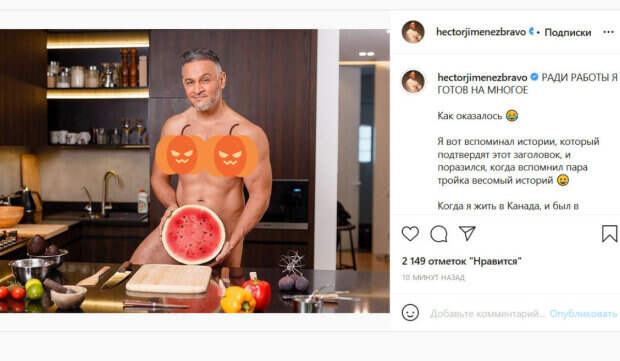 В качестве примера он рассказал, что в свое время переехал из Канады на Мальдивы всего лишь ради одного проекта. Также шеф-повар признался, что очень ответственно подходит к выбору людей, которые работают на него. По словам Хименес-Браво, он не готов брать на работу неподходящих людей даже под давлением и угрозами. «Ну и конечно съемки. Были по 2 сутки подряд, были по 2 сутки подряд + съемка реклама потом, но самый тяжелый был для меня прямой эфир “Танцуют все”… Я так волновался, меня тошнило, кружилась голова, нервы был на пределе, в общем, все как в фильме», - вспомнил Эктор. Однако, больше чем текст поста украинцев заинтересовало фото, которым Хименес-Браво проиллюстрировал публикацию. На снимке шеф-повар позирует на кухне совершенно без одежды, прикрываясь разрезанным арбузом. Такой неординарный кадр вызвал бурную реакцию в сети. «Фу какая гадость!», «Фото перебор конечно», «Совсем рехнулся )) Я была лучшего мнения о нём», «Ого... нет очень красиво...Фигура у вас супер...молодец очень откровенно... вот это смелое фото!», «Эктор ты шалун», «Да ну! Такого мы вас ещё не видели!!», «Мммм... какой мужчина не каждый может себя держать в такой форме! Молодчина!», «Эктор, вы горячее духовки разогретой до 180 градусов», - пишут люди. Напомним, Хименес-Браво, уехавший из Украины, неожиданно засветил кольцо на безымянном пальце. Как сообщала Politeka, Хименес-Браво рассказал о расставании с возлюбленной-украинкой. Также Politeka писала, что Хименес-Браво откровенно рассказал о своей депрессии, поделившись печальным опытом.