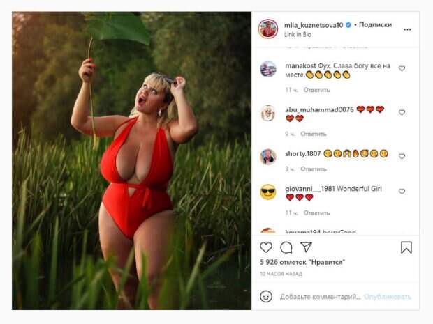 Известная модель Мила Кузнецова, которая обладает 15-м размером бюста, показала себя на прогулке На фото Мила позировала в красном купальнике с большим вырезом. Звезда держала в руке большой листик, а образ дополнила стильными очками. Красотка в таком виде гуляла среди травы. Кузнецова засмотрелась на листик и даже открыла рот от удивления.