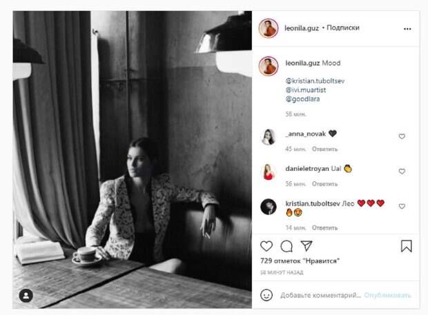 Образы Гузь публикует в Инстаграм, где за ней следят почти 100 тысяч фанатов. В этот раз Леонила показала, как отдыхала в заведении. Девушка была в пиджаке, который решила расстегнуть. На столике можно увидеть чашку с напитком, а в руке сигарету. "Настроение", - написала Леонила. Фанаты поставили почти тысячу лайков и написали комментарии: "Лео", "Дива", "Релаксирующее настроение", "Мечта". На втором фото девушка стояла в нижнем белье перед зеркалом. Красотка снимала себя на телефон, демонстрируя свою фигуру, благодаря чему заслужила комплименты от пользователей: "Соблазнительная принцесса", "Вы случайно закинули", "Это прекрасно". Мы писали, что известная украинская модель Леонила Гузь впечатлила кадрами с отдыха. На свежем снимке Гузь была запечатлена во время отдыха. На фоне виднелись пальмы, а ее кожа получила нежный загар, который свидетельствует о длительном пребывании на солнце. Напомним, мисс Украина Леонила Гузь заворожила романтичным видом в наряде в сеточку, едва прикрыв самое сокровенное Также Politeka писала, что мисс Украина Леонила Гузь показала характер плохой девочки в полупрозрачном платье с кружевом А еще Politeka сообщала, что мисс Украина Леонила Гузь блеснула загорелым бюстом в соблазнительном мини