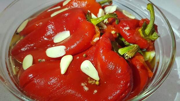 Ингредиенты: 1 кг сладкого перца (выбирайте мясистый, цвет любой) половина головки чеснока 1 ст. л. уксуса 9% 2 ст. л. растительного масла 5 шт. черного перца горошком 1/3 ч. л. сахара 1/2 ч. л. соли Приготовление (ВИДЕО): Перец помыть и высушить. Противень застелить фольгой, выложить перец.