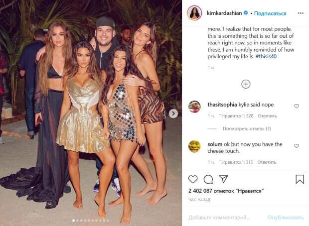 В новом посте Ким рассказала, что по этому случаю устроила для своей семьи и друзей необычный сюрприз: после тестирования на китайский вирус она организовала им поездку на частный остров, где они смогли танцевать, кататься на байках, плавать с китами и смотреть кино на берегу. «40 и чувствую себя такой смиренной и благословенной. Нет ни одного дня, который я принимаю как должное…Я понимаю, что для большинства людей это сейчас недостижимо, поэтому такие моменты мне смиренно напоминают о том, насколько привилегирована моя жизнь», - написала Ким в своем посте. На фото с острова саму именинницу можно увидеть в коротком золотом платье с белыми вставками и глубоким декольте, которое идеально подчеркнуло ее пышную грудь. Распущенные волосы, легкий макияж и золотые украшения удачно дополнили ее образ. Поклонники звезды буквально засыпали ее пост лайками и комплиментами в комментариях. Ранее мы писали, что Кардашьян показала себя на празднике. На фото светская львица запечатлена в блестяжем коктейльном платье желтого цвета, которое плотно обтянуло ее выдающиюся грудь и бедра. Можно заметить, что Ким не надела бюстгальтер. На одном из снимков она зажгла вместе со своими сестрами Кортни и Хлоей, держа в руках таблички. Напомним, постаревшая Ким Кардашьян в "невидимом" купальнике засмущала видом на побережье: "На 40 не выглядишь". Как сообщала Politeka, Ким Кардашьян зажгла с сестрами на вечеринке и вызвала восторг знойным видом без белья. Также Politeka писала, что Ким Кардашьян и Пэрис Хилтон заворожили безупречными фигурами в велюре.